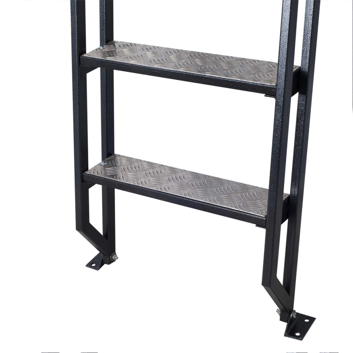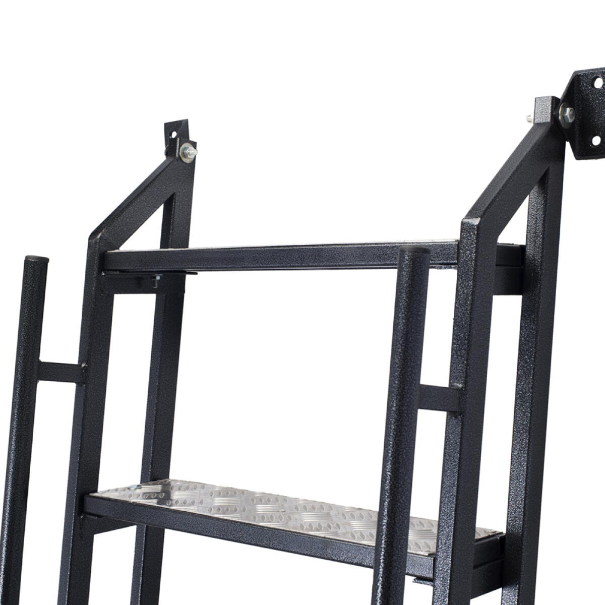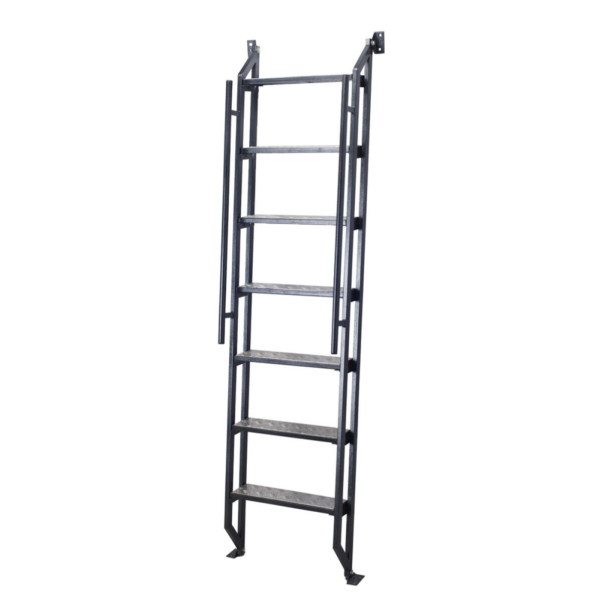 Стальная приставная лестница со антискользящими алюминиевыми ступенями. Фиксируется крепёжными элементами через поворотные кронштейны к полу и вертикальной стене. Косоуры и ступени на болтовом соединении (полностью разборная конструкция).