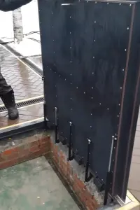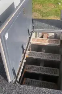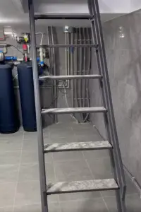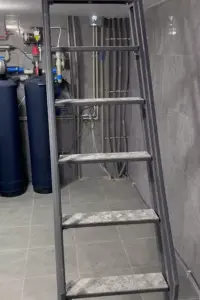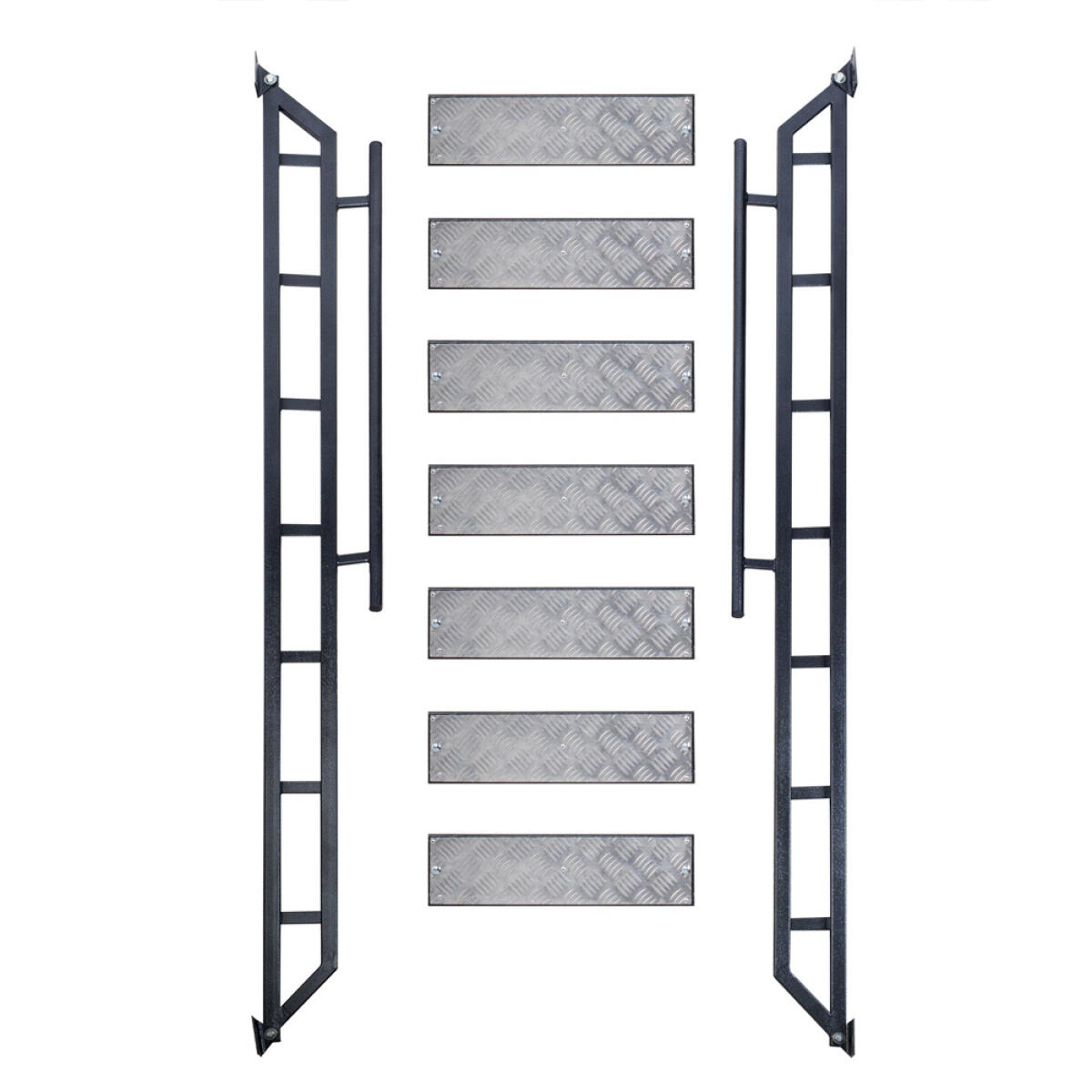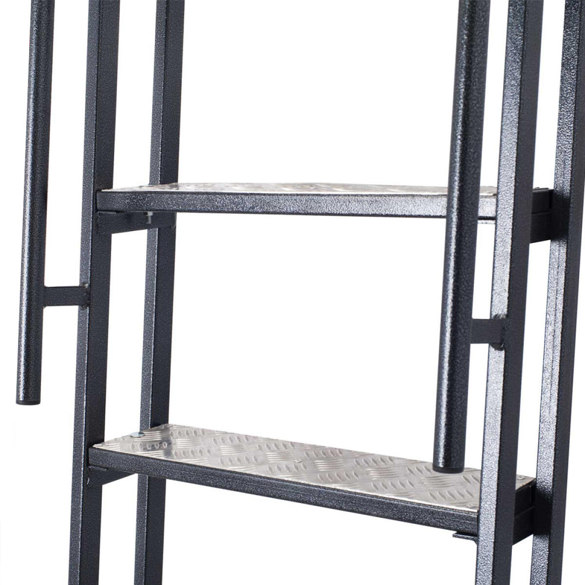 Стальная приставная лестница со антискользящими алюминиевыми ступенями. Фиксируется крепёжными элементами через поворотные кронштейны к полу и вертикальной стене. Косоуры и ступени на болтовом соединении (полностью разборная конструкция).